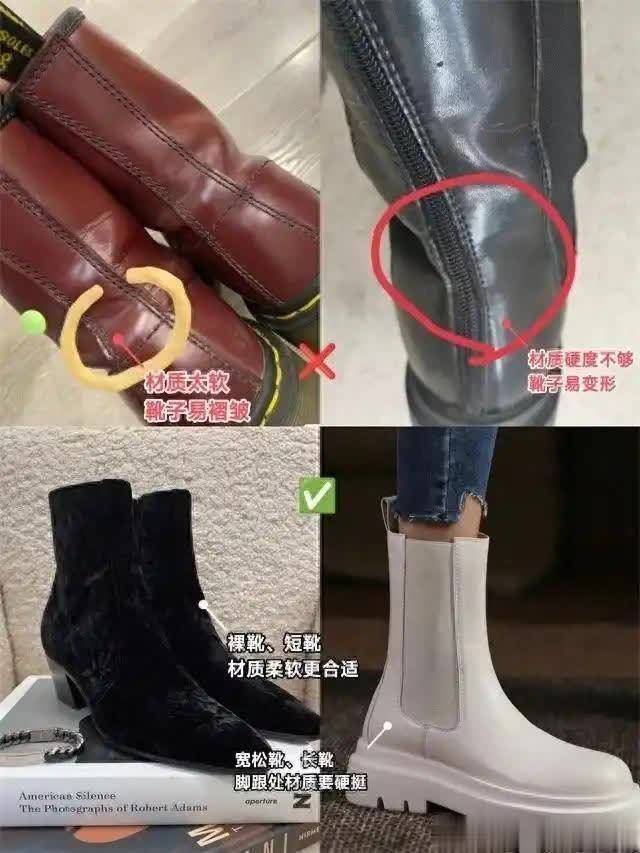 挑选靴子很重要,材质选错易拉低气质。太软的材质易褶皱,硬度不够易变形。应选柔软有弹性的材质,如挺括有型的皮料,以保持靴子立体感与舒适度。